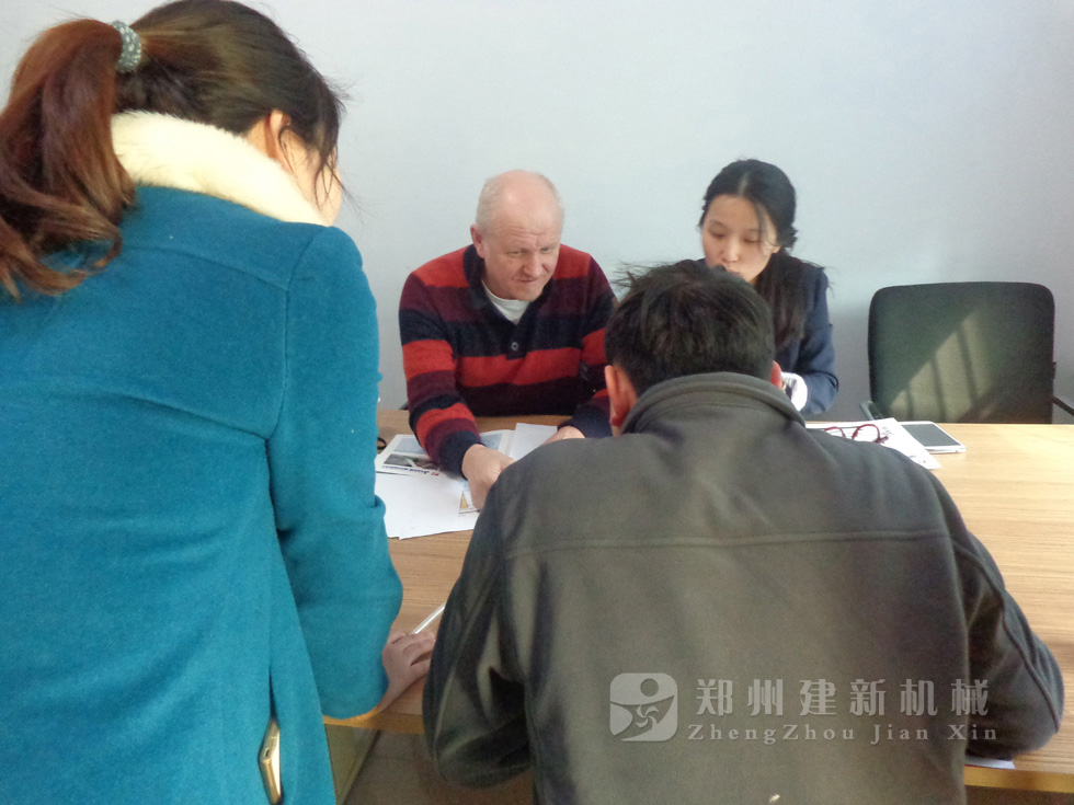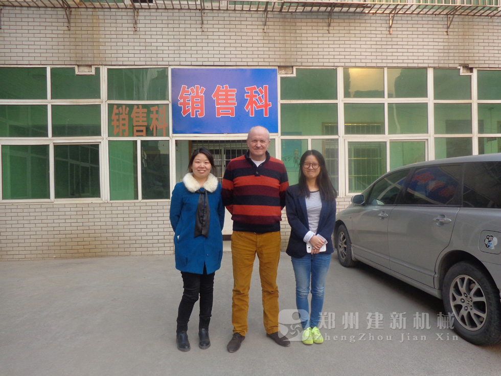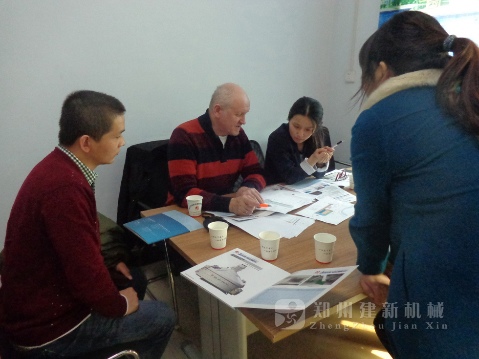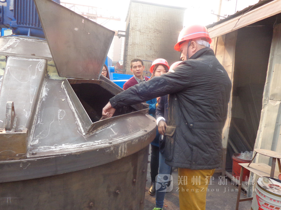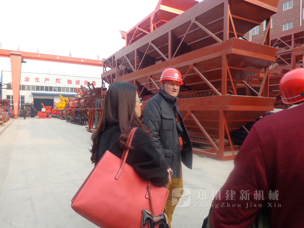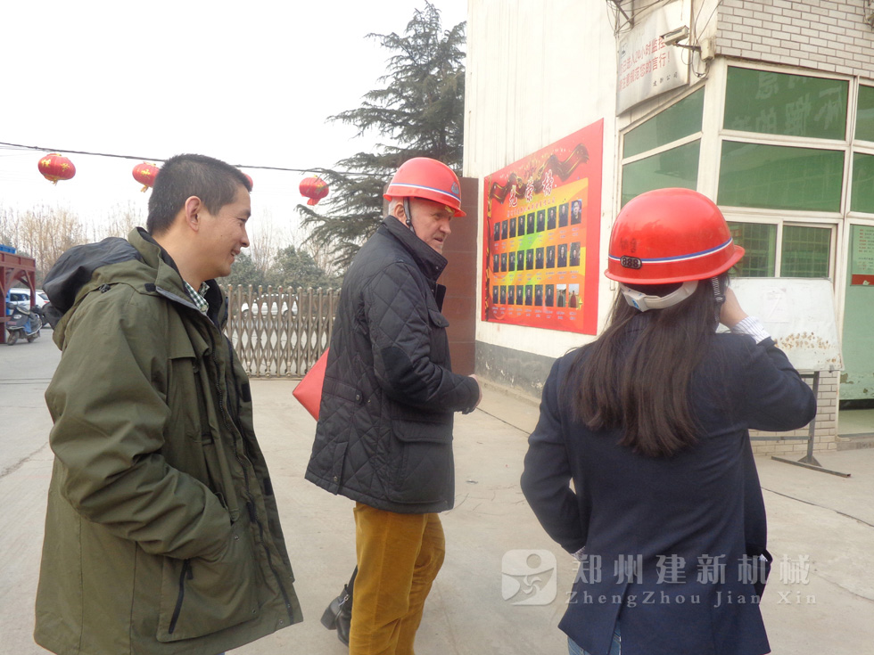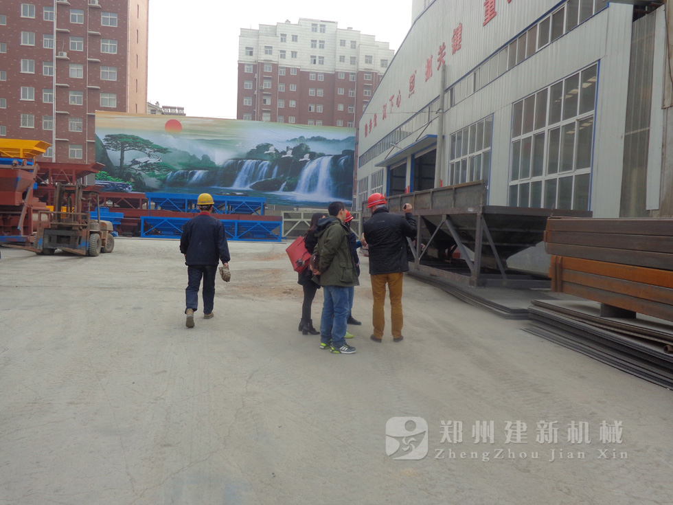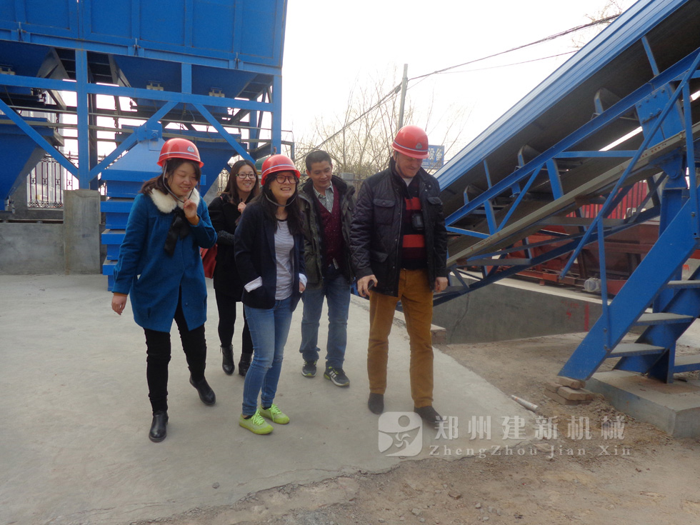 2014年11月,来自俄罗斯的客户来到郑州建新公司签订了两套时产120方混凝土搅拌站设备的大订单,下图为建新公司销售部刘经理、经理带客户参观建新公司的生产车间及成品货场。